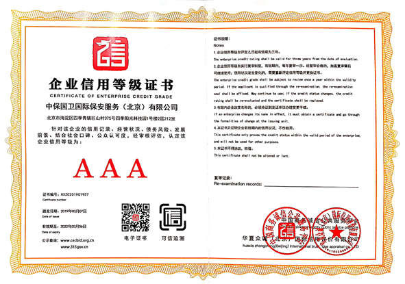 企業信用等級證書AAA級